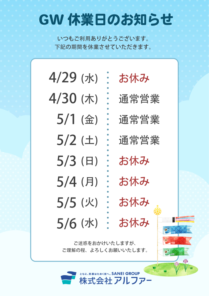 【全社GW休業日】 5月3日(日)~6日(水) 4日間